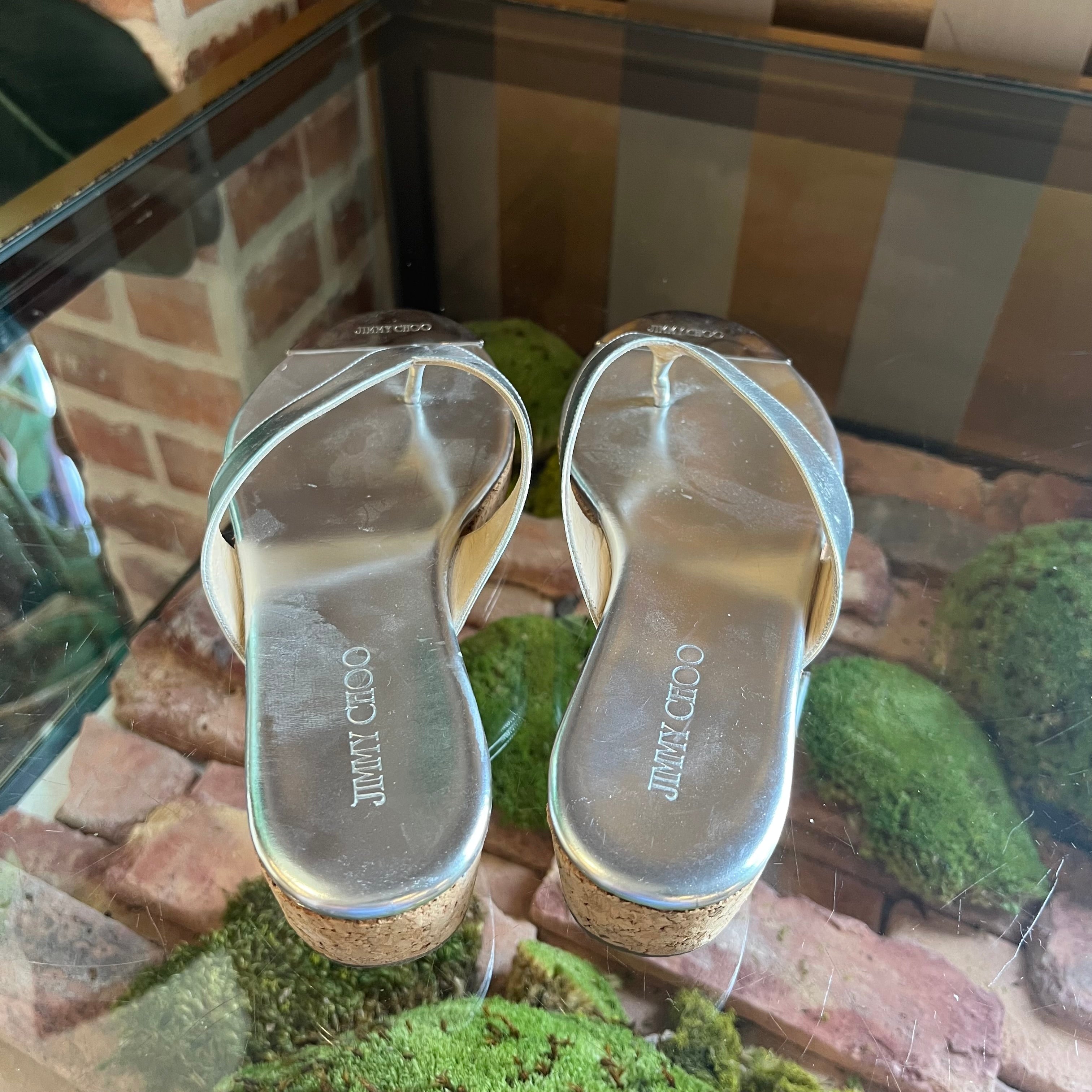 - Shimmery silver-tone straps with subtle Jimmy Choo branding