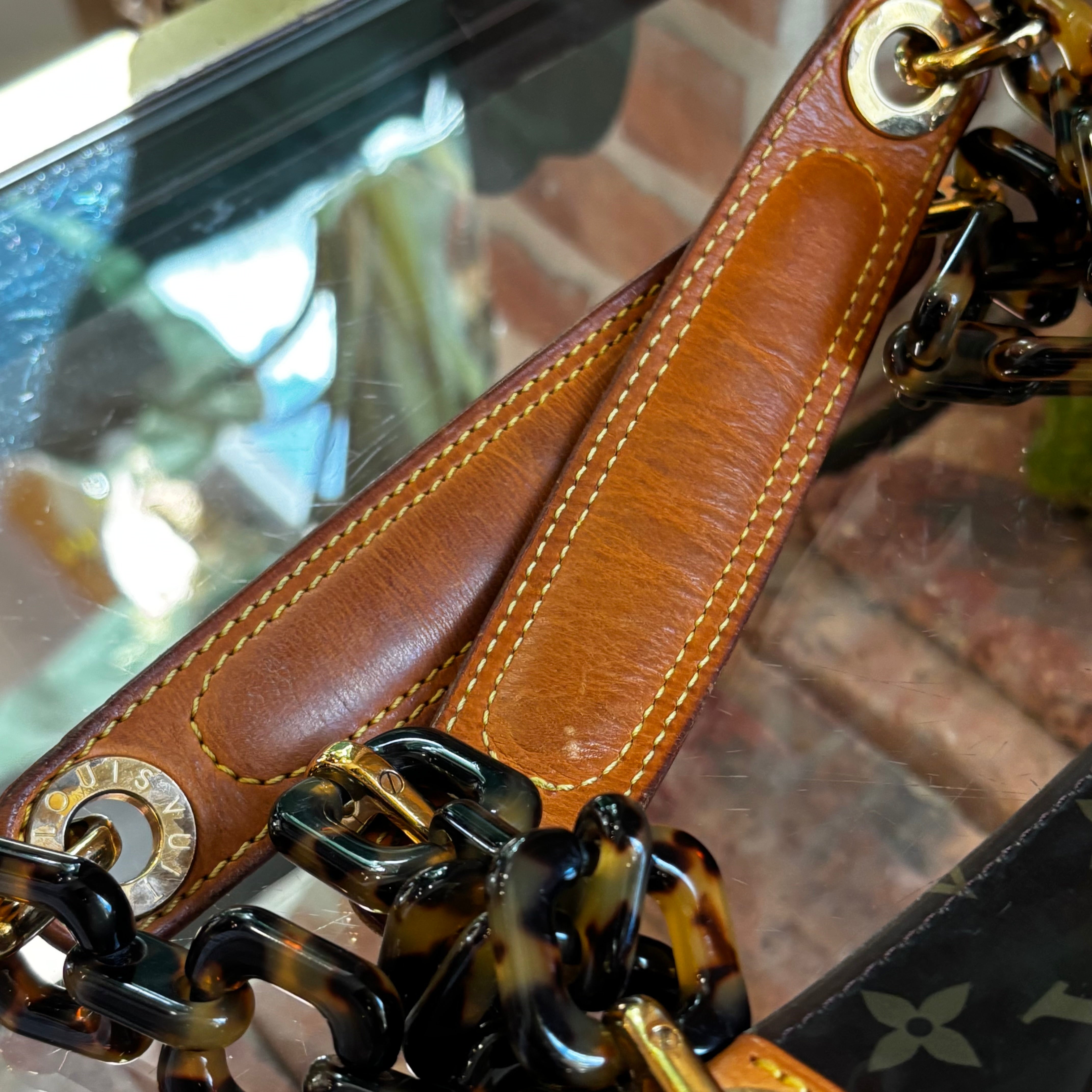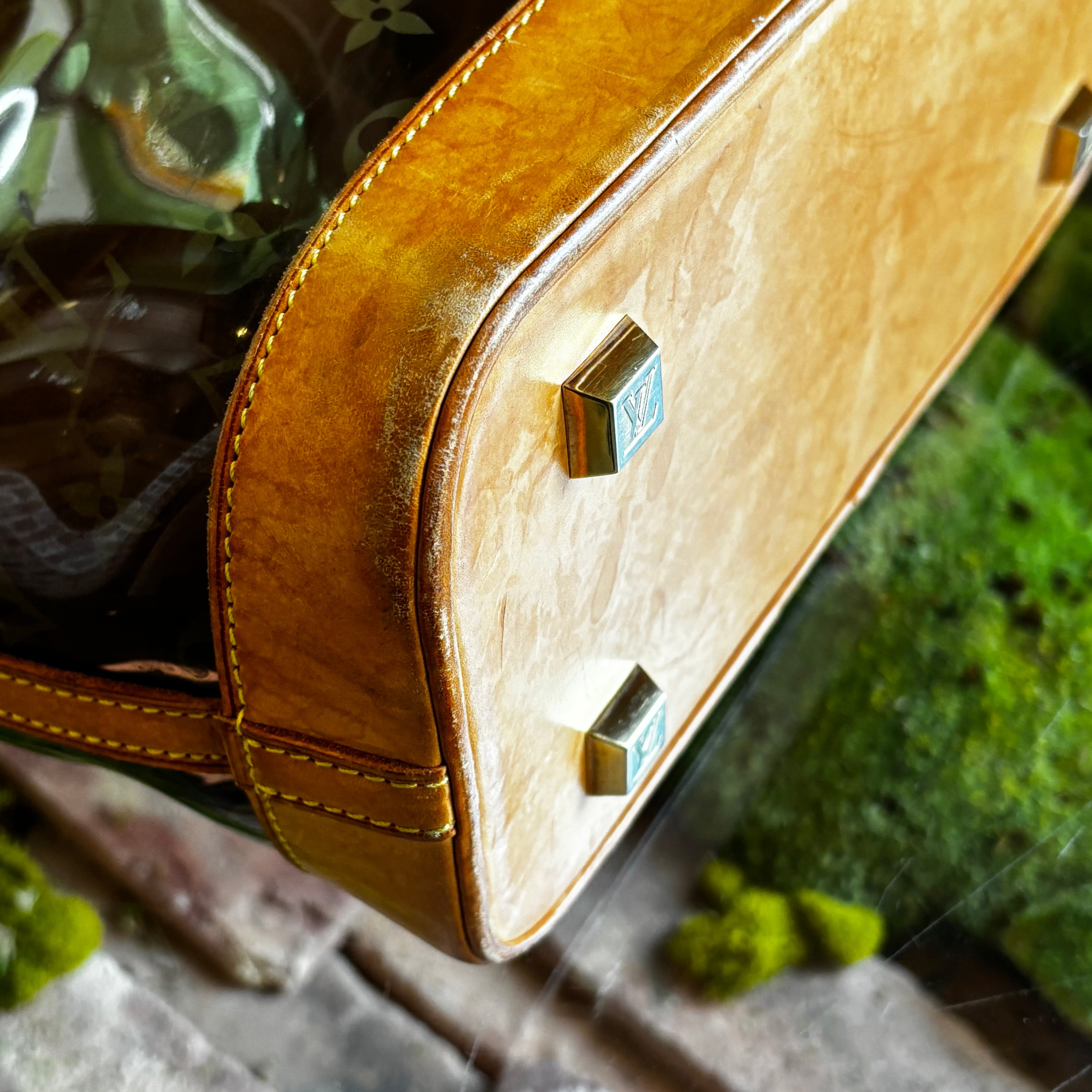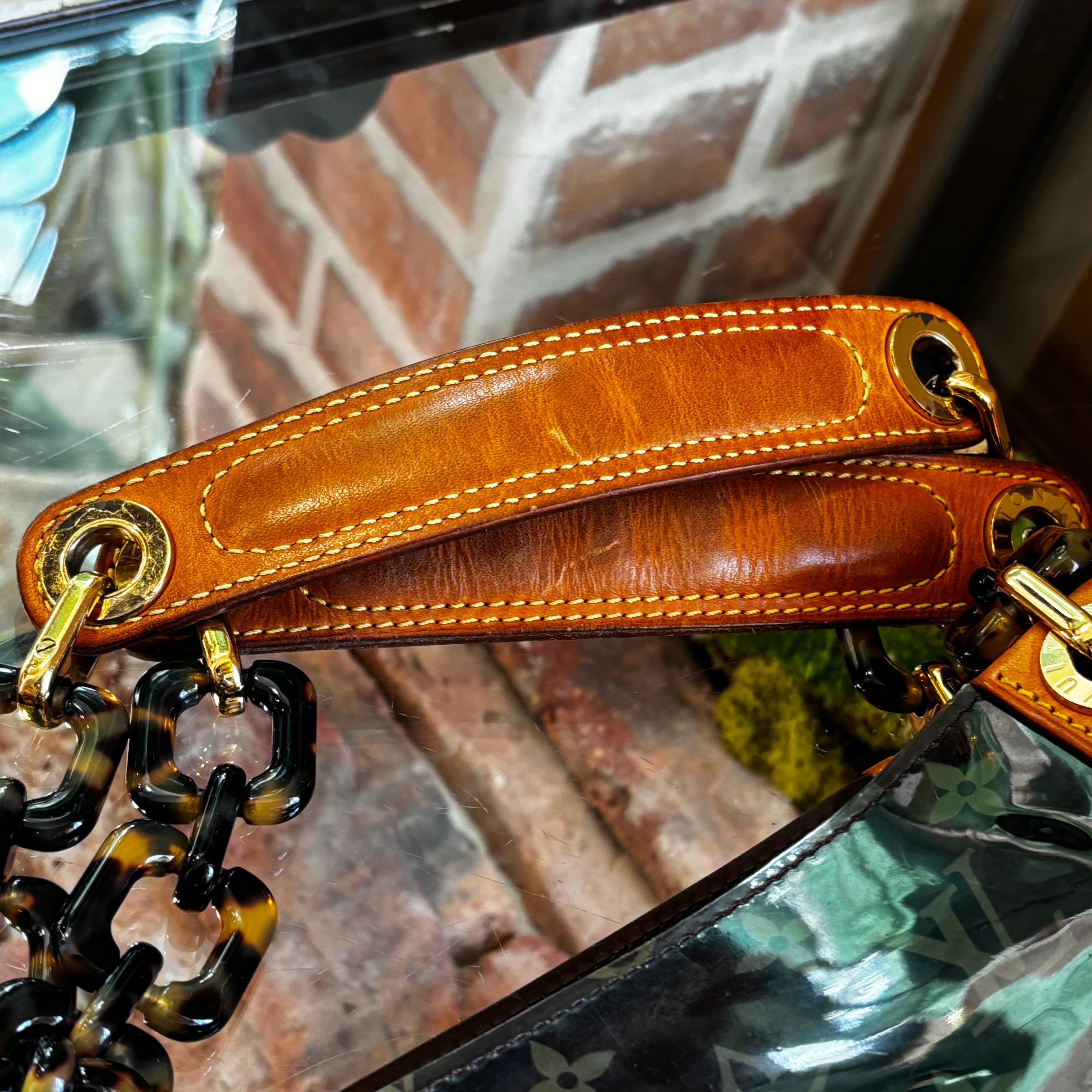 - Handle + Vachetta Leather Trim: The vachetta leather has patianed displaying wear such as: water spots, scuffing, soiling, rubbing, markings, creasing, scratches while appearing darker in certain areas(please refer to photos).