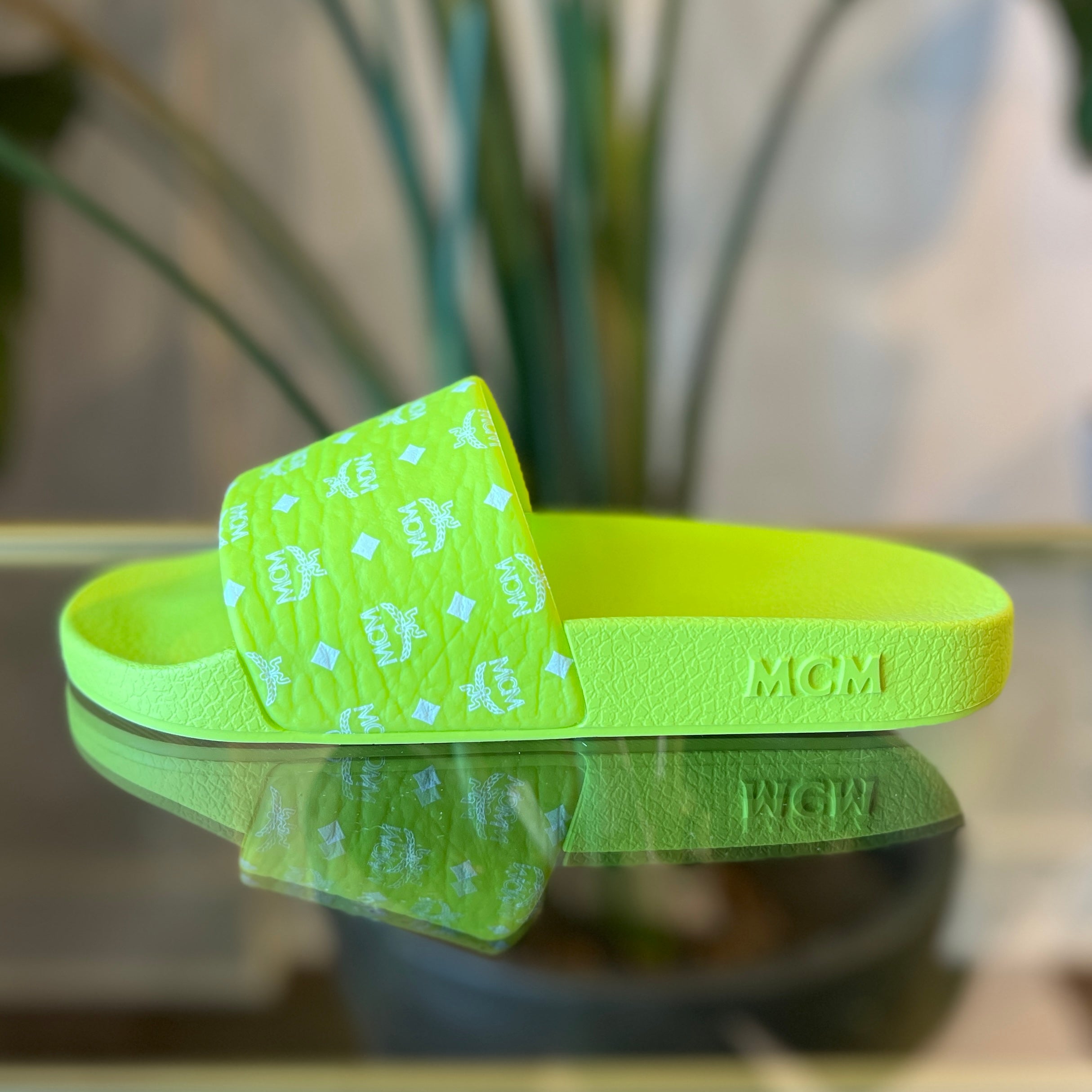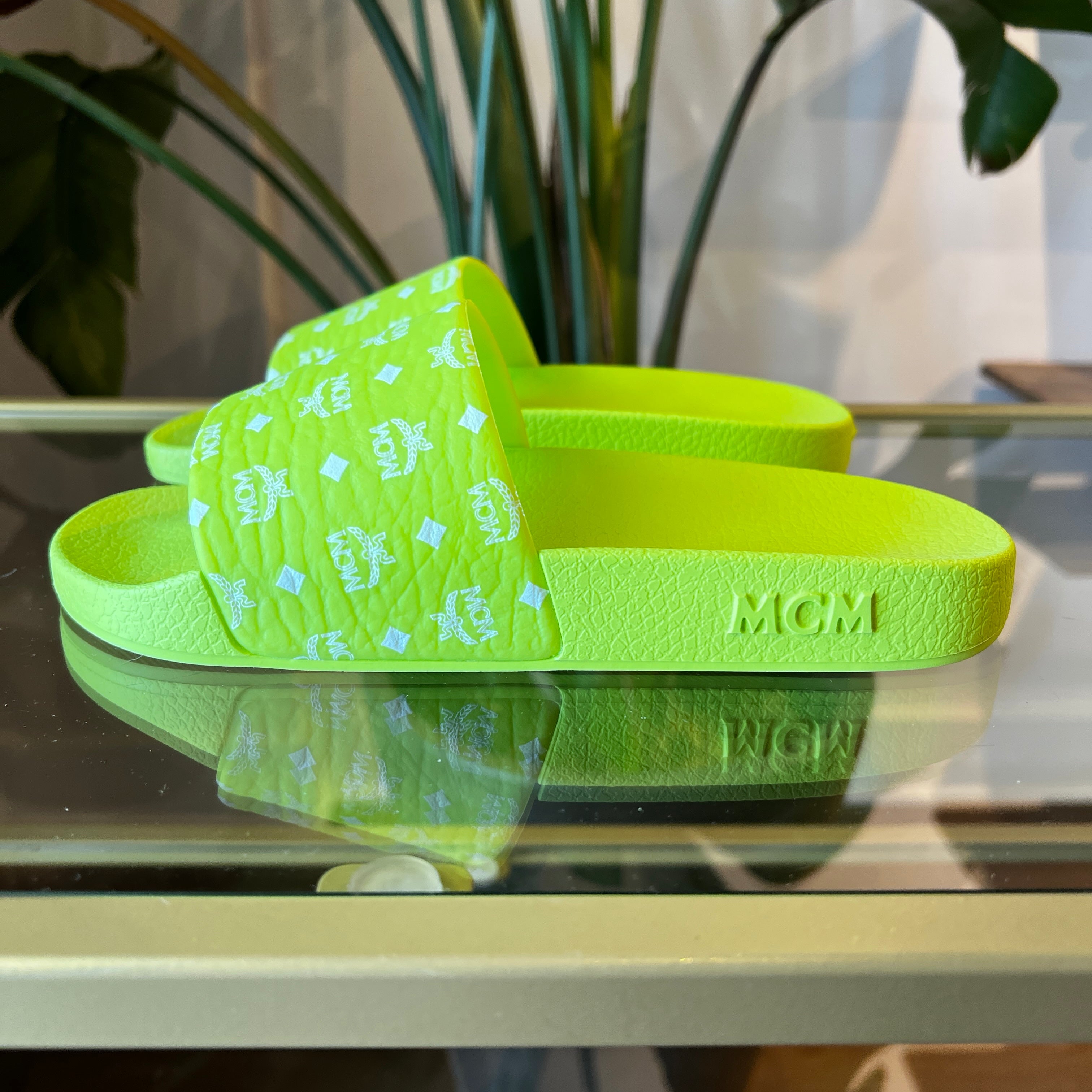 Elevate your casual style with these MCM lime green monogram print rubber slides. Crafted for comfort and durability, they feature a vibrant monogram design that adds a refined touch to your everyday look. Perfect for effortless wear, these slides combine luxury branding with practical ease. Very good condition.