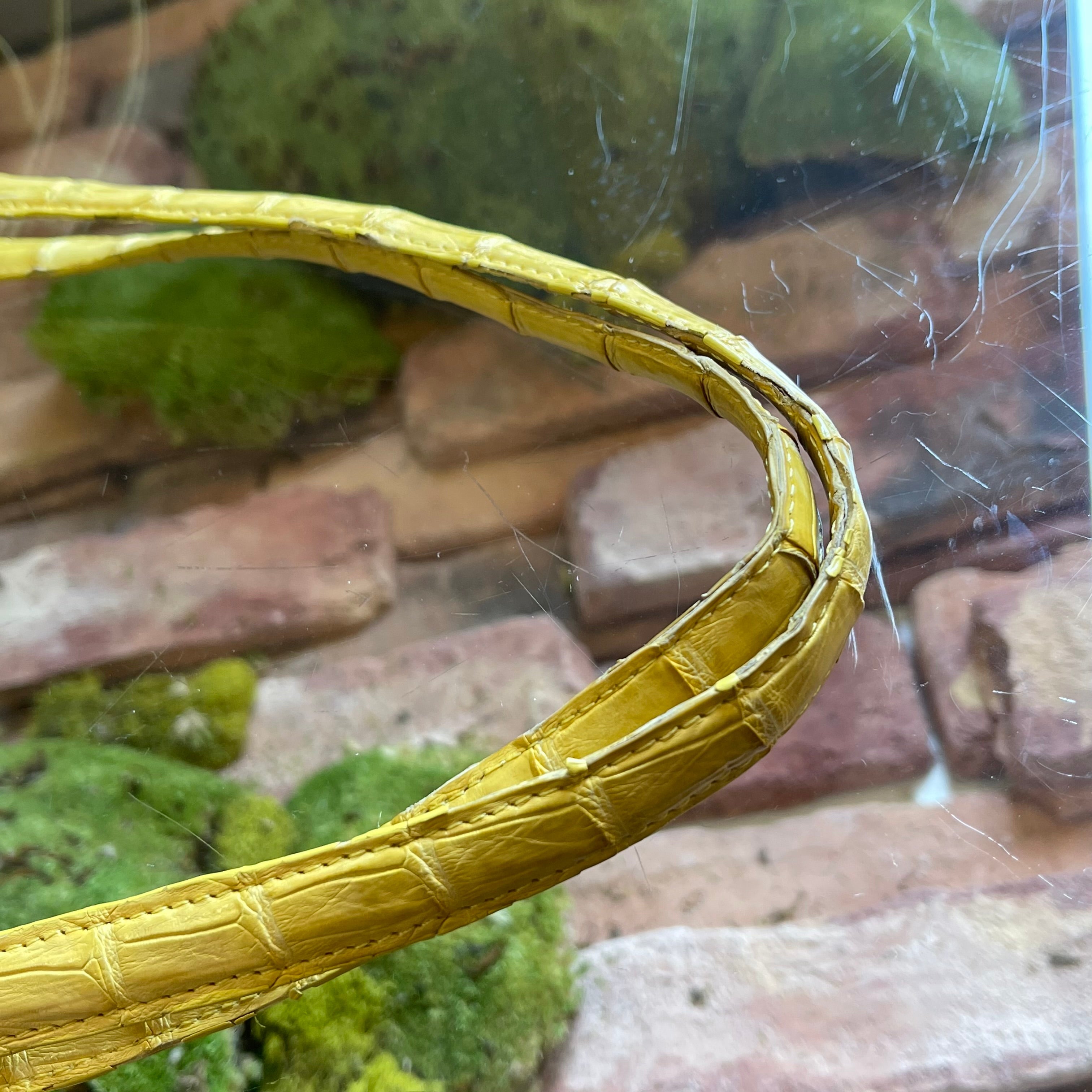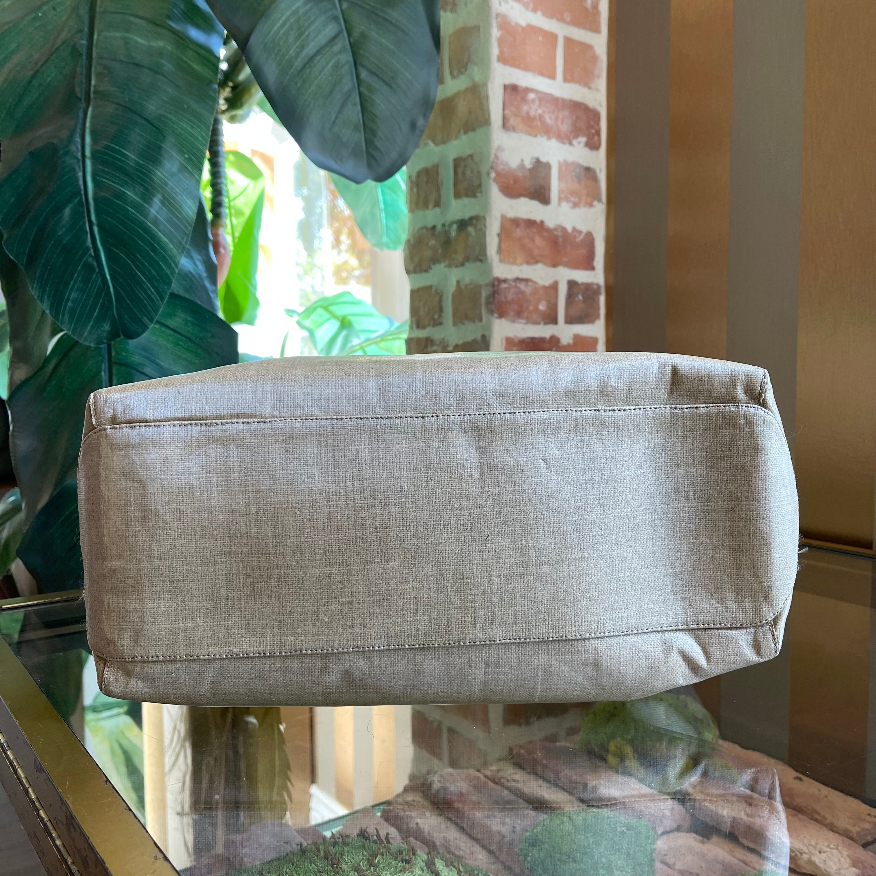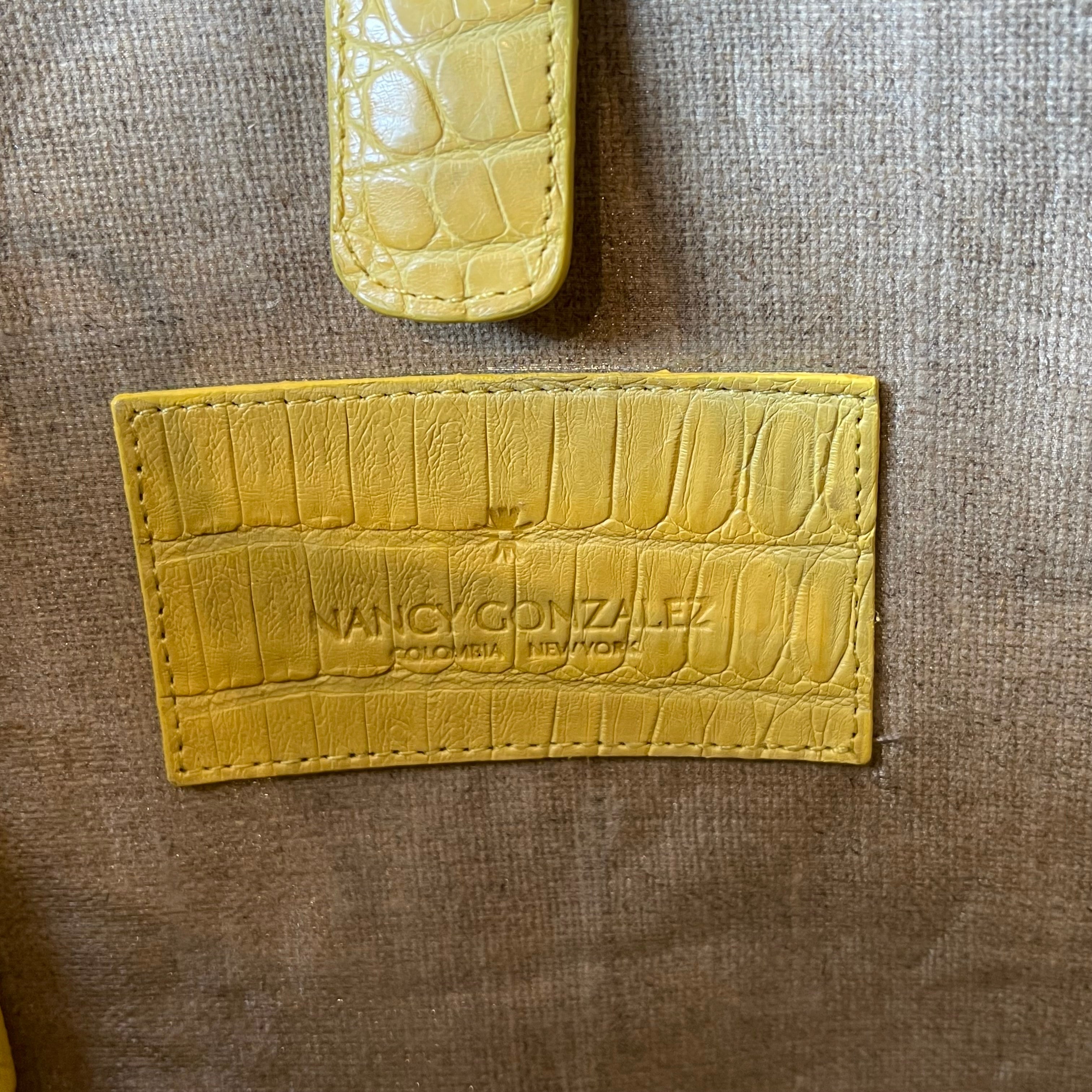 The NANCY GONZALEZ Yellow/Beige Coated Linen Crocodile Medium Erica Shopper Tote is a stylish and functional bag. It features a unique combination of coated linen and exotic crocodile accents, perfect for adding a touch of luxury to your everyday ensemble. It's in very good condition. The corners, along the top, the edge of the straps & the bag charm exhibit moderate rubbing. The pouch has a white mark. Loose thread. Although the coated canvas remains vibrant & unfaded. The interior has a stain which could possibly be cleaned if desired after purchase although it is wearable without overall it's in very good condition.